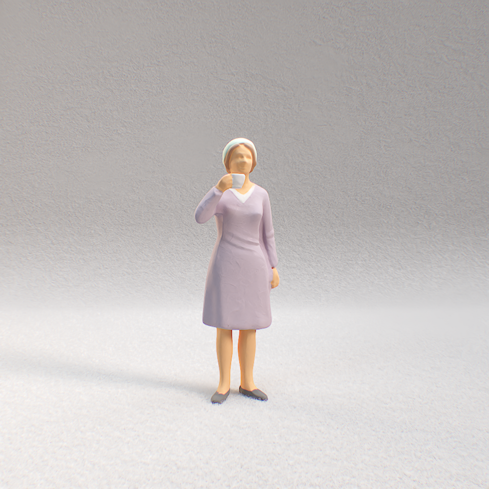 This character is part of the Coffee People collection. A French Woman Standing drinking cofee with a purple coat.